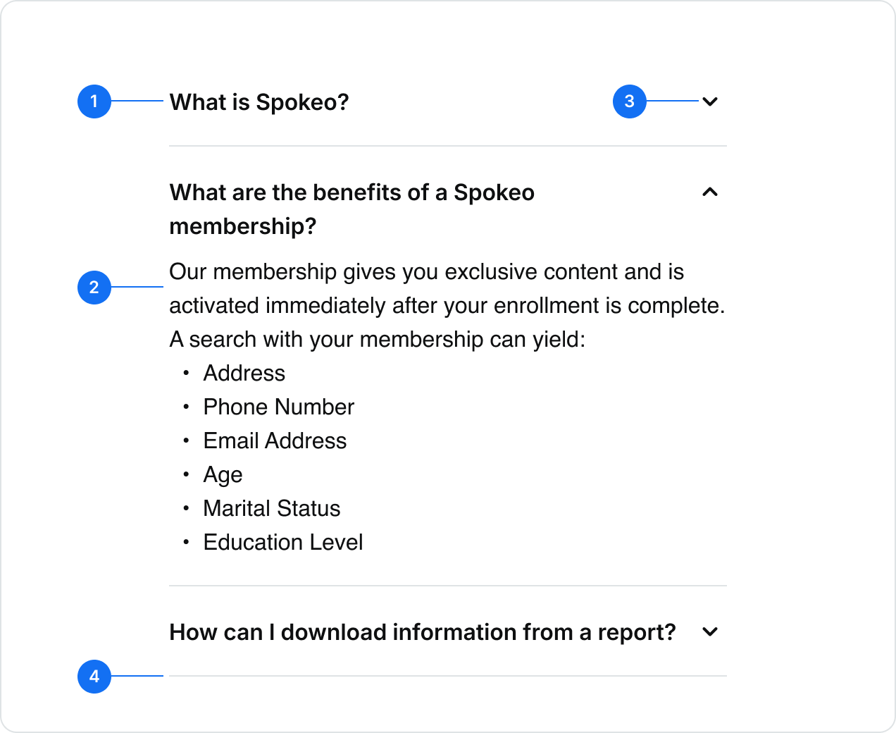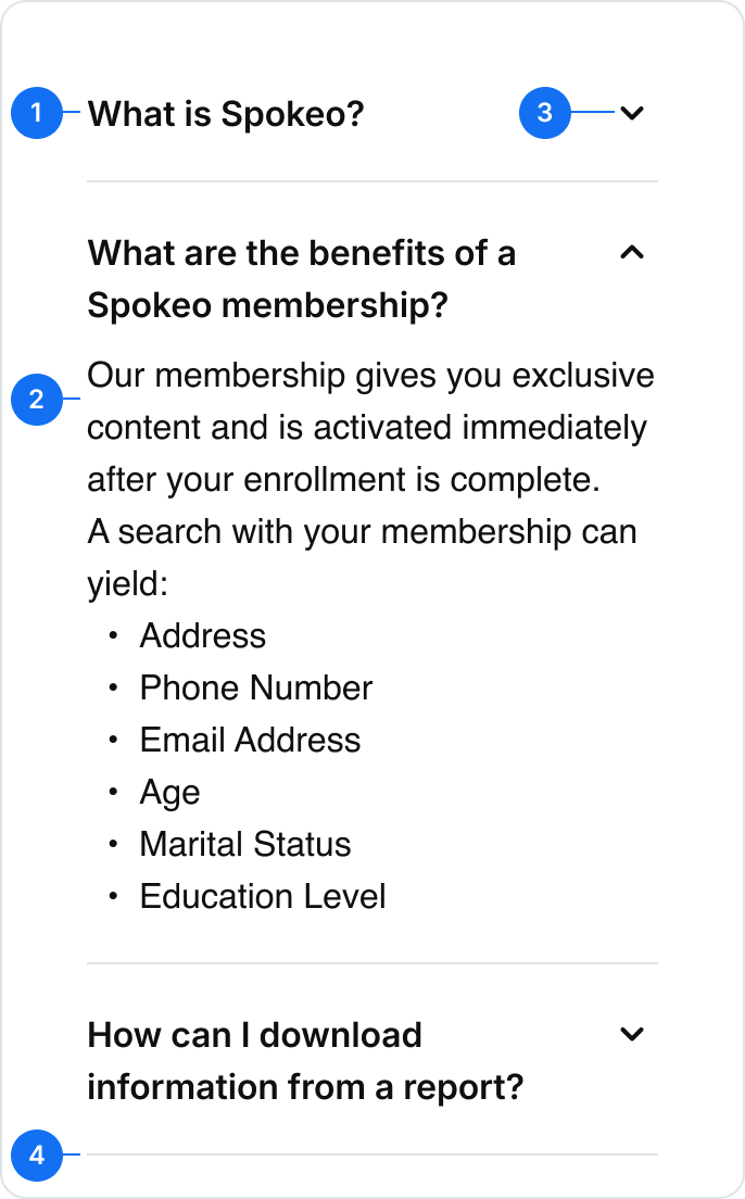 Accordions group related content into sections users can expand or collapse. They reduce cognitive load, but shouldn’t hide information required for the task at hand.