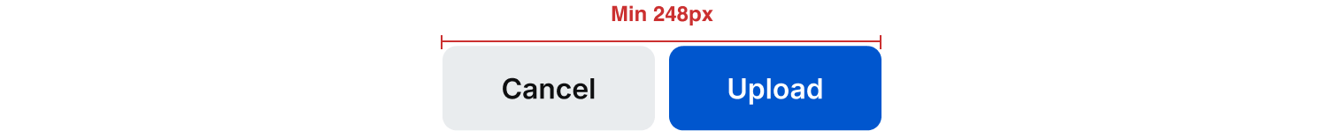 Try to set a minimum of 248px for our buttons while in their default position. For our stacked button group, these are typically used for mobile screens which start at our 799px breakpoint. In this instance we typically set the component to fill the space.