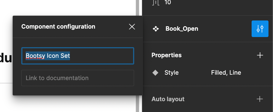 When using the Bootsy icon set, add the icon set name to the Component Configuration description and place the icon under the “From Bootsy” category on the artboard.